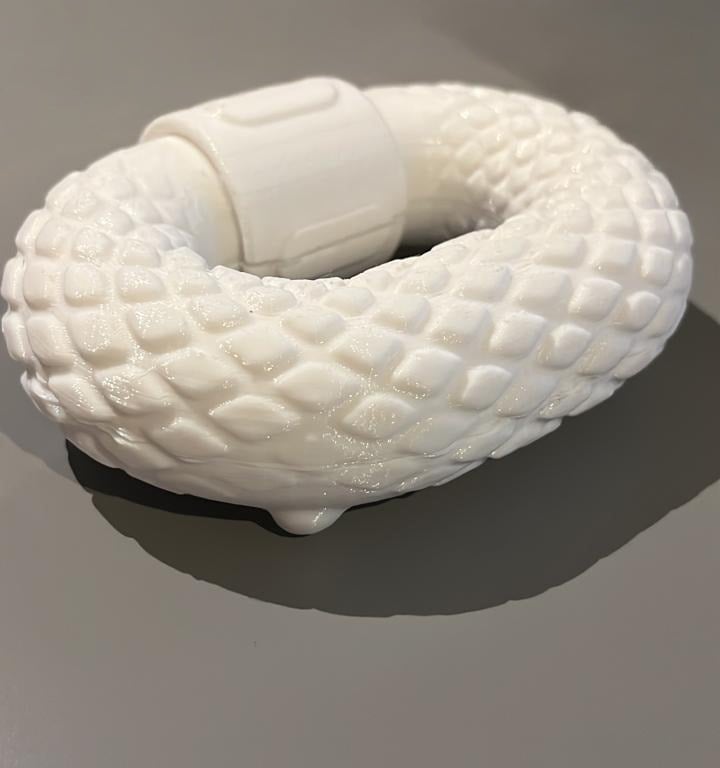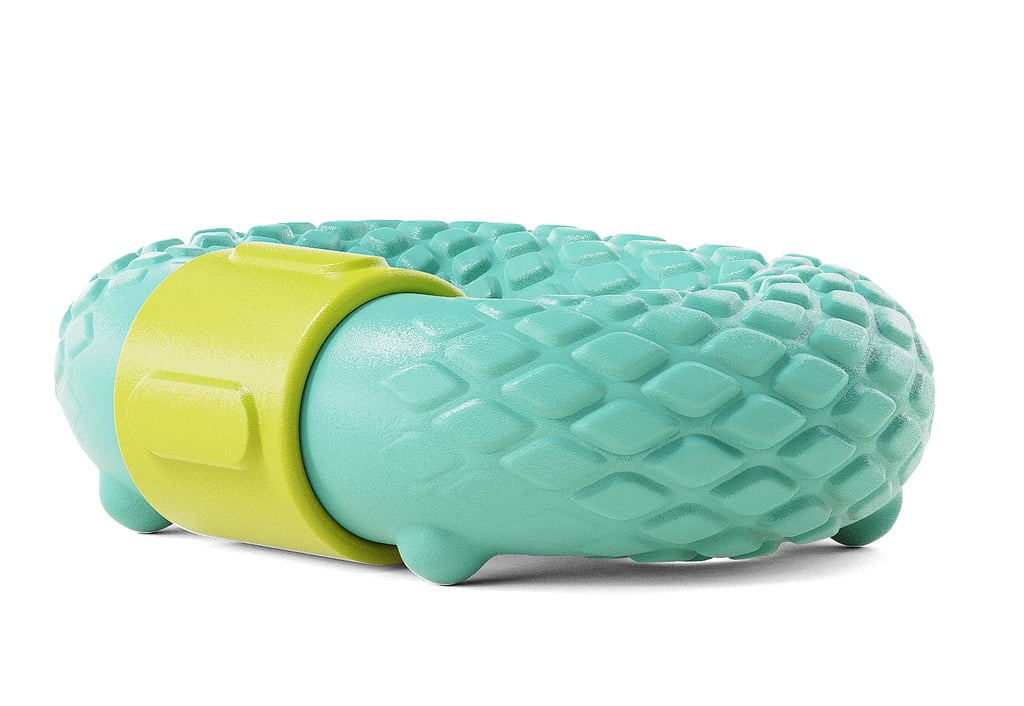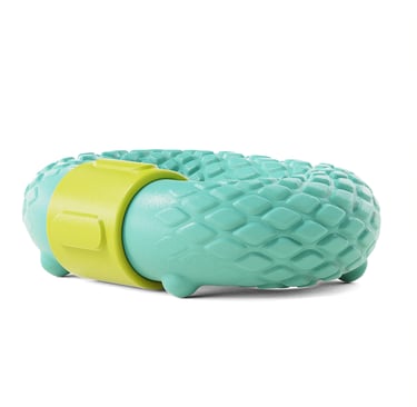 The textured surface simulates a reptilian skin pattern, enhancing grip, and providing tactile surface. The form includes subtle character features such as small feet and a rounded organic shape to add visual personality.