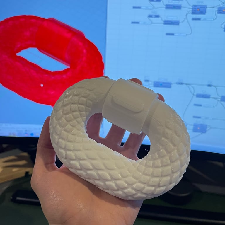 A 3D-printed prototype was developed to validate the design and assess its real-world performance. This physical model enabled the evaluation of scale, ergonomics, and the effectiveness of the diamond-shaped texture, which was generated parametrically in Grasshopper.